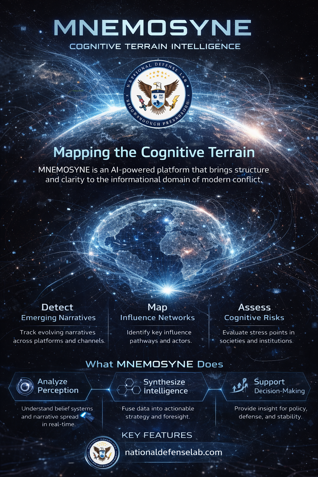 Washington, DC — National Defense Lab today announced the launch of MNEMOSYNE, an AI-powered cognitive terrain intelligence platform designed to help leaders understand, assess, and anticipate threats within the information environment.
